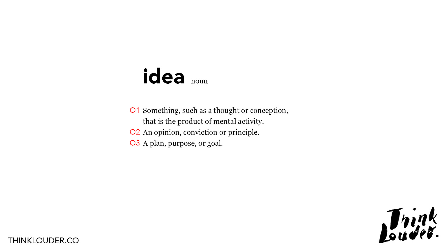 While this is the textbook definition of ideas, I think of ideas a bit differently. This list is not exhaustive, but it serves as a good reference point for the work we'll be doing.